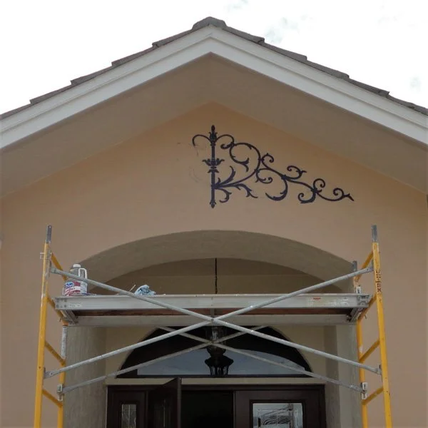 The homeowner requested I hand paint a decorative wrought iron design to fit within this triangular shaped area. To help accentuate the entrance even more, the front and garage doors were faux finished to look like a dark walnut woodgrain.